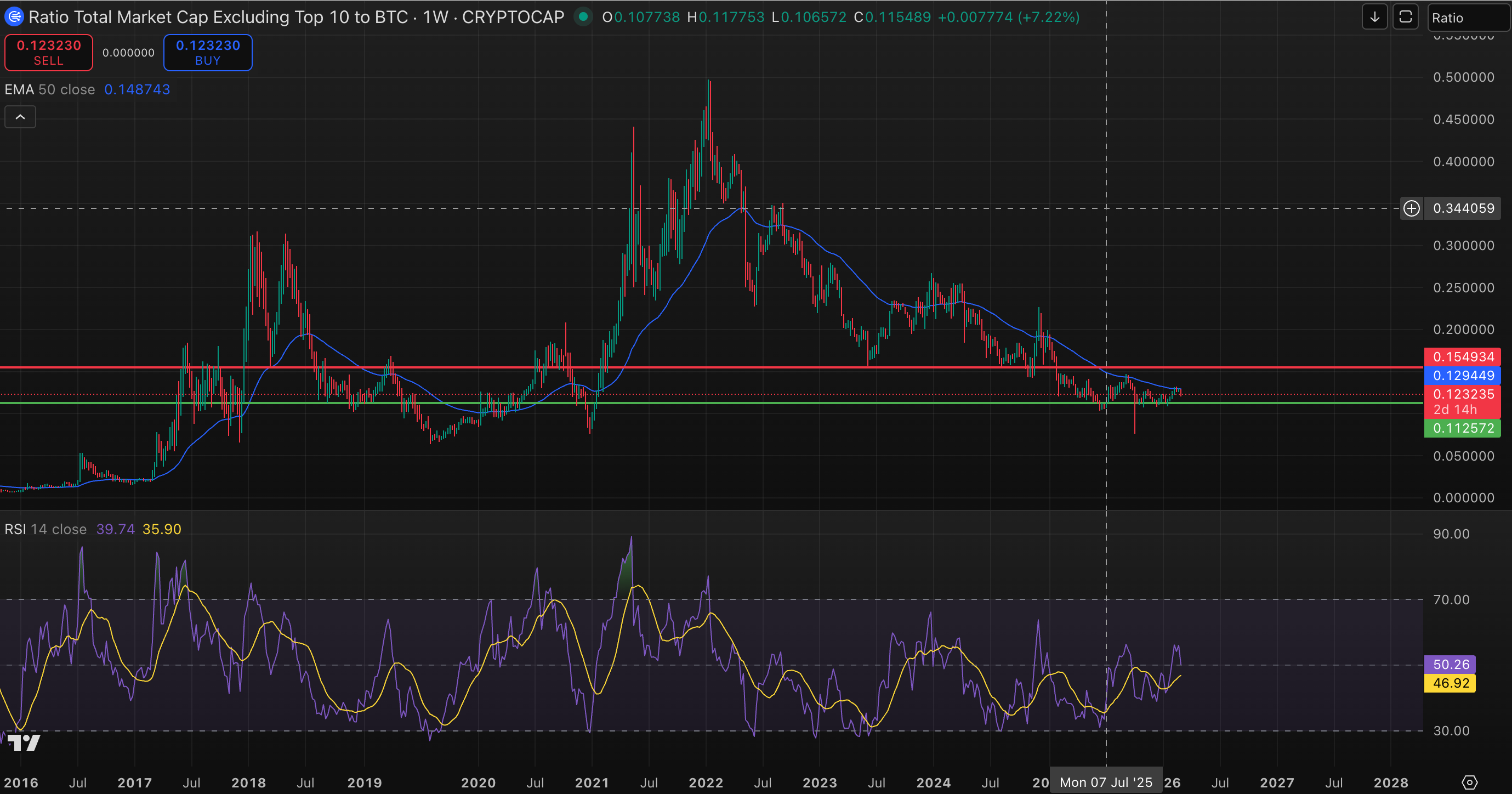- The ratio of altcoins (excluding top 10) to bitcoin is looking likely to close above the 50-week exponential moving average, implying no clear breakout for altcoinss relative to BTC.