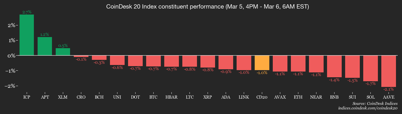 Bitcoin’s price has fallen about 3.7% in the last day, but it’s still trading just above $70,000. Overall, the cryptocurrency market, as measured by the CoinDesk 20 (CD20) index, is down 3.5% as the recent price increases slow down. Bitcoin hit a high of over $74,000 on Wednesday, and remains more than 6% higher over the past five days.
