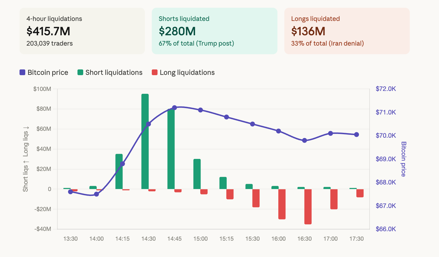 - The liquidations, led by bitcoin, ether and tokenized oil contracts, underscored how derivatives-heavy markets can turn modest net price moves into severe losses for leveraged traders when news shifts rapidly.